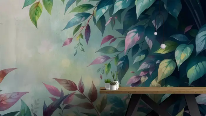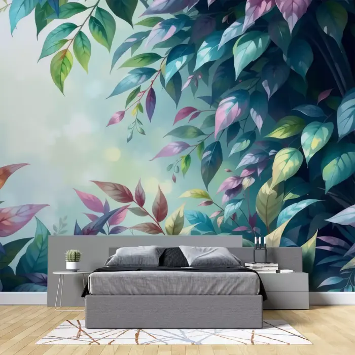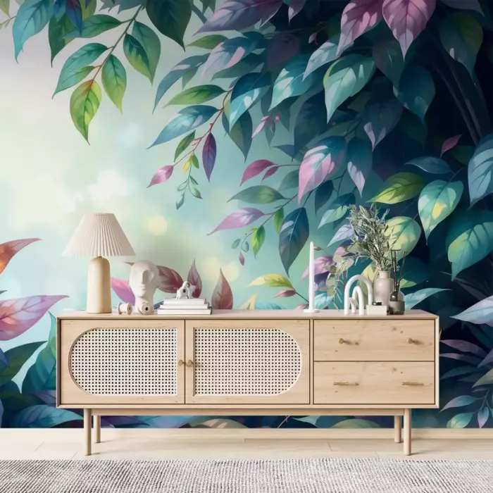 Cette image est une magnifique fresque murale vibrante qui apporte la beauté luxuriante d’une jungle mystique directement dans votre maison. Les feuilles et les branches sont finement détaillées, créant une sensation de profondeur et de mouvement. Les couleurs sont riches et variées, avec des nuances de vert, de violet et de rose qui ajouteront une touche de magie à n’importe quelle pièce. Parfaite pour créer une atmosphère sereine et apaisante, cette fresque ne manquera pas de susciter des conversations.